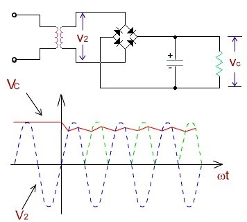 (1)電容濾波,所示在負載電阻上并聯(lián)了一個濾波電容C。電容是隔直通交,電壓不能突變。所以只能并聯(lián)在電路中,直流電從負載過,交流電就從電容過,從而達到濾波的目的。由于電容的儲能作用,使得輸出波形比較平滑。電容放電的時間τ=RLC越大,放電過程越慢,輸出電壓中脈動 (紋波:是主電流信號附帶的雜訊成分,小幅度交流電,無法完全隔絕,一般要求在主電壓的1%內(nèi)即可,如供電12V,那么要求電源的紋波不能大于120毫伏) 成分越少,濾波效果越好(電壓平滑)。